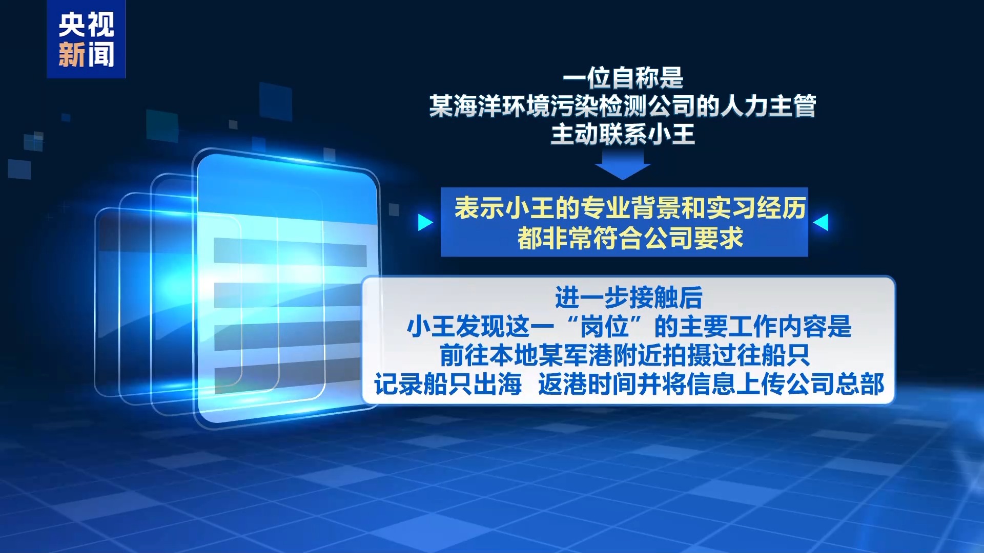 小王大学毕业后,在网上送达简历。一位自称是某海洋环境浑浊检测公司的东谈主力主宰主动琢磨小王,暗示小王的专科配景和实习经历齐相称稳妥公司要求。进一步战争后,小王发现这一“岗亭”的主要责任本体是赶赴腹地某军港近邻拍摄过往船只,纪录船只出海、返港时辰并将信息上传公司总部。小王联思到大学时波折受的国度安全教练,卤莽进行举报。国度安全机关窥探发现,该公司存在境外配景,涉嫌拍摄监测我伏击军港艨艟情况动向。小王因提供伏击印迹获取国度安全机关奖励。