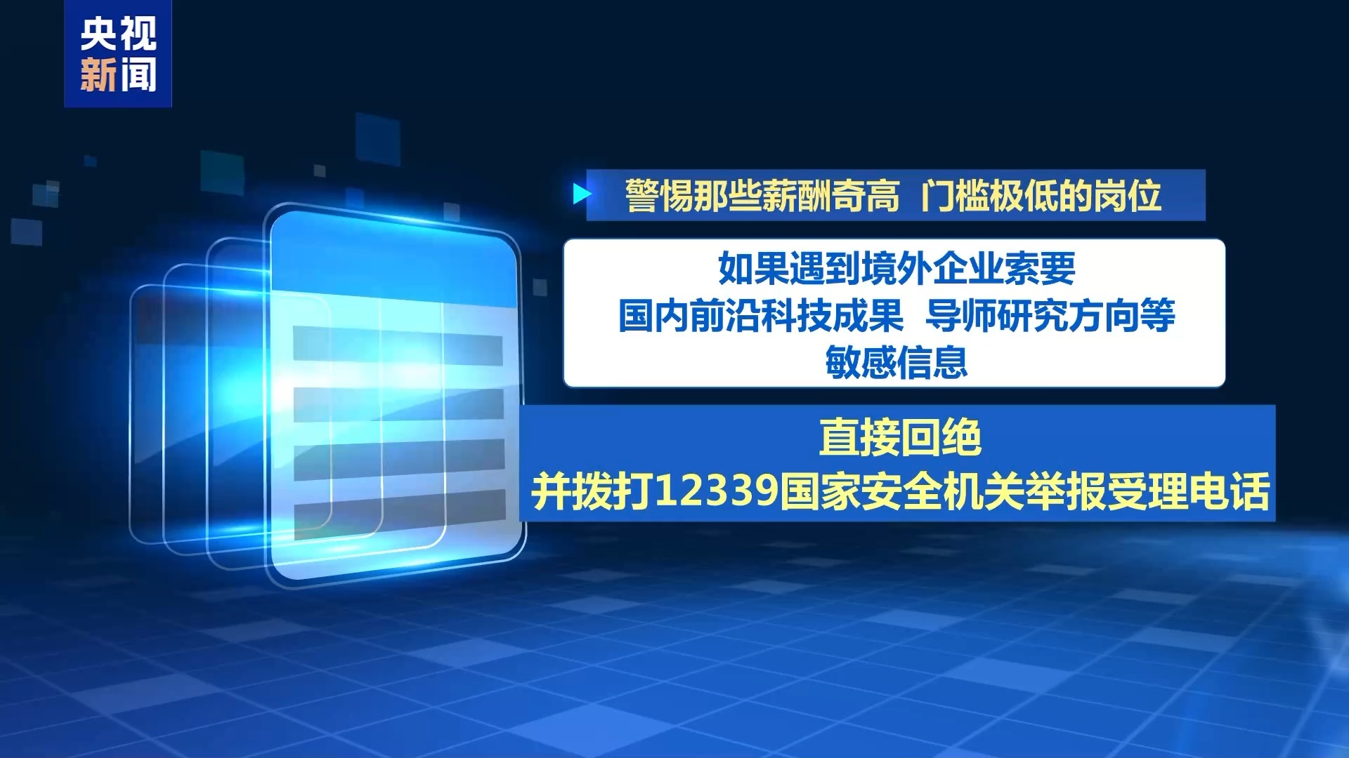 第二,警惕薪酬奇高、门槛极低的岗亭。若是际遇境外企业索求国内前沿科技停止、导师筹商标的等敏锐信息,平直谢绝并拨打12339国度安全机关举报受理电话。看守国度安全,即是看守我方的将来。