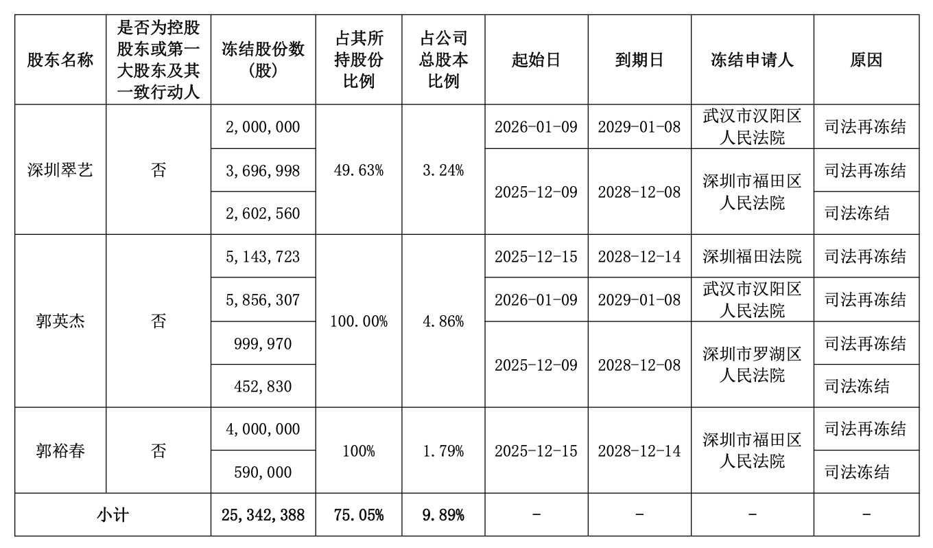 随后,萃华珠宝清楚《对于捏股5%以上鼓吹股份被国法冻结、国法再冻结及轮候冻结的公告》,称于近日收到捏股5%以上鼓吹深圳翠艺及一致行动东谈主奉告,并通过中国证券登记结算有限职守公司深圳分公司系统查询,获悉深圳翠艺、郭豪杰、郭裕春所捏有的公司部分股份被国法冻结、国法再冻结及轮候冻结。