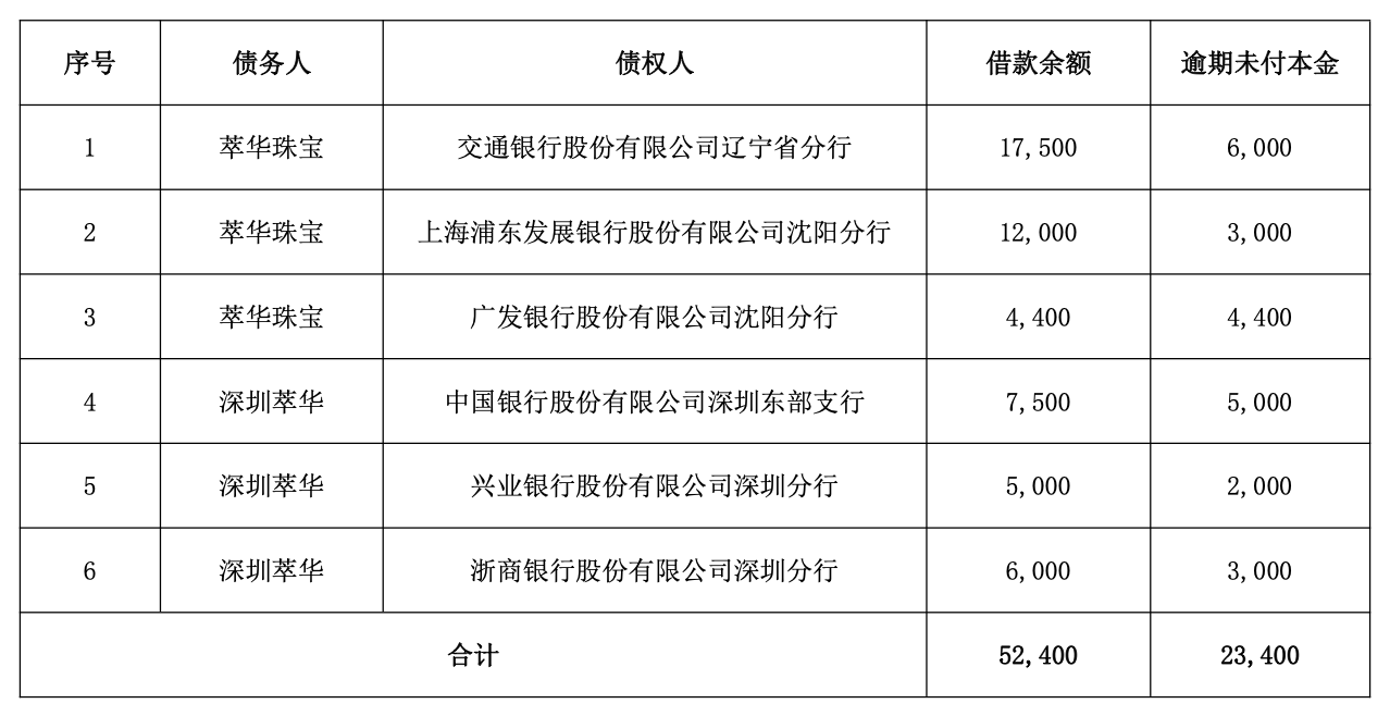 萃华珠宝格外子公司告贷过时情况