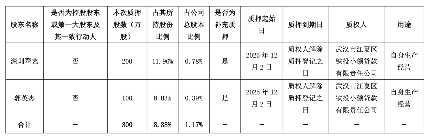 在同日清楚的《对于捏股5%以上鼓吹及一致行动东谈主股份质押的公告》中,萃华珠宝称获悉其鼓吹深圳市翠艺投资有限公司(简称“深圳翠艺”)和郭豪杰将其捏有的公司部分股份办理了质押业务,质押股份数为200股和100股,占其所捏股份比例11.96%和8.03%,占公司总股本比例0.78%和0.39%。