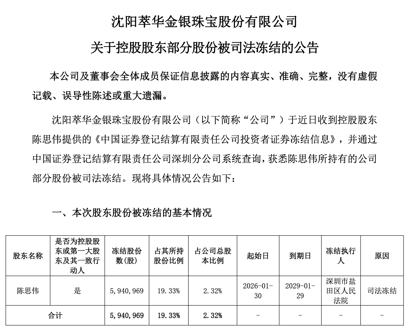 萃华珠宝清楚《对于控股鼓吹部分股份被国法冻结的公告》