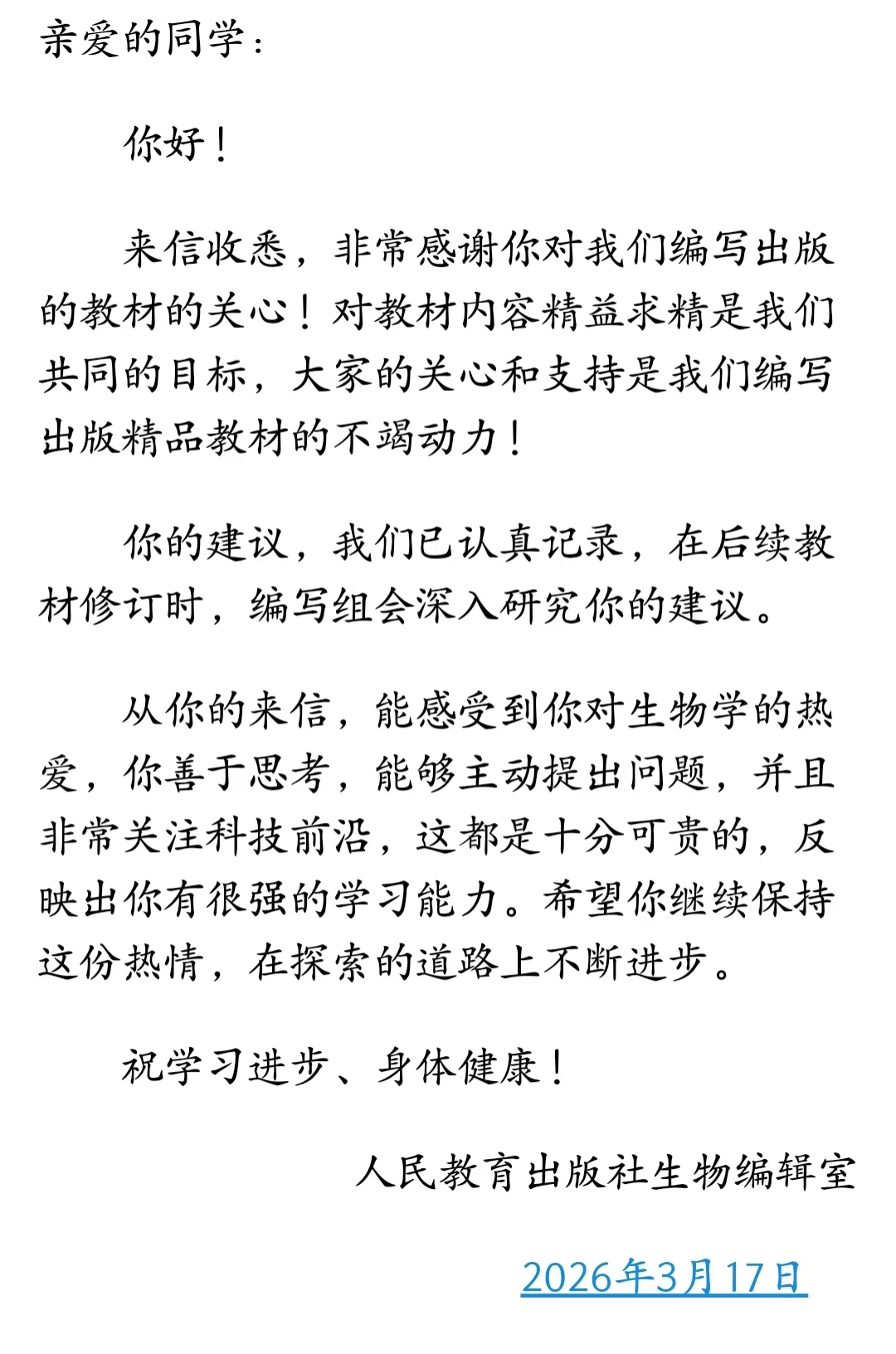 3月17日,东说念主教社对其进行了覆信,信中说:“荒谬感谢你对咱们编写出书的教材的眷注!对教材推行锦上添花是咱们共同的筹画,寰球的眷注和维持是咱们编写出书极品教材的抑止能源!你的建议,咱们已严防记载,在后续教材改良时,编写组会深远筹议你的建议。从你的来信,能感受到你对生物学的艳羡,你善于念念考,大约主动提议问题,何况荒谬关注科技前沿,这齐是十分珍摄的,反应出你有很强的学习才智。但愿你连续保捏这份情愫,在探索的说念路上赓续跳跃。”