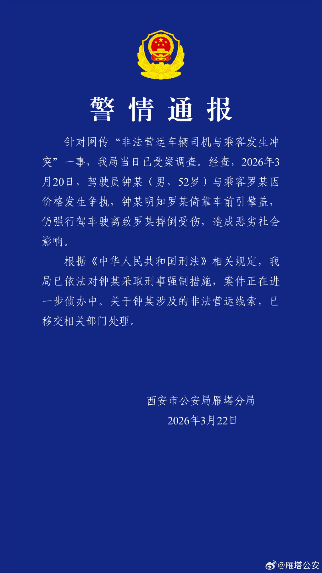 据西安市公安局雁塔分局官方微博@雁塔公安 3月22日发布警情通报,针对网传犯警营运车辆司机与乘客发生糟蹋一事,该局当日已受案探访。经查,2026年3月20日,驾驶员钟某(男,52岁)与乘客罗某因价钱发生争捏,钟某明知罗某倚靠车前引擎盖,仍强行驾车驶离致罗某颠仆受伤,形成恶劣社会影响。 说明《中华东谈主民共和国刑法》相干规则AG中国手机官方网页版,该局已照章对钟某选拔刑事强制法子,案件正在进一步侦办中。对于钟某波及的犯警营运踪影,已派遣相干部门贬责。 BG真人(BigGaming)官方网站...