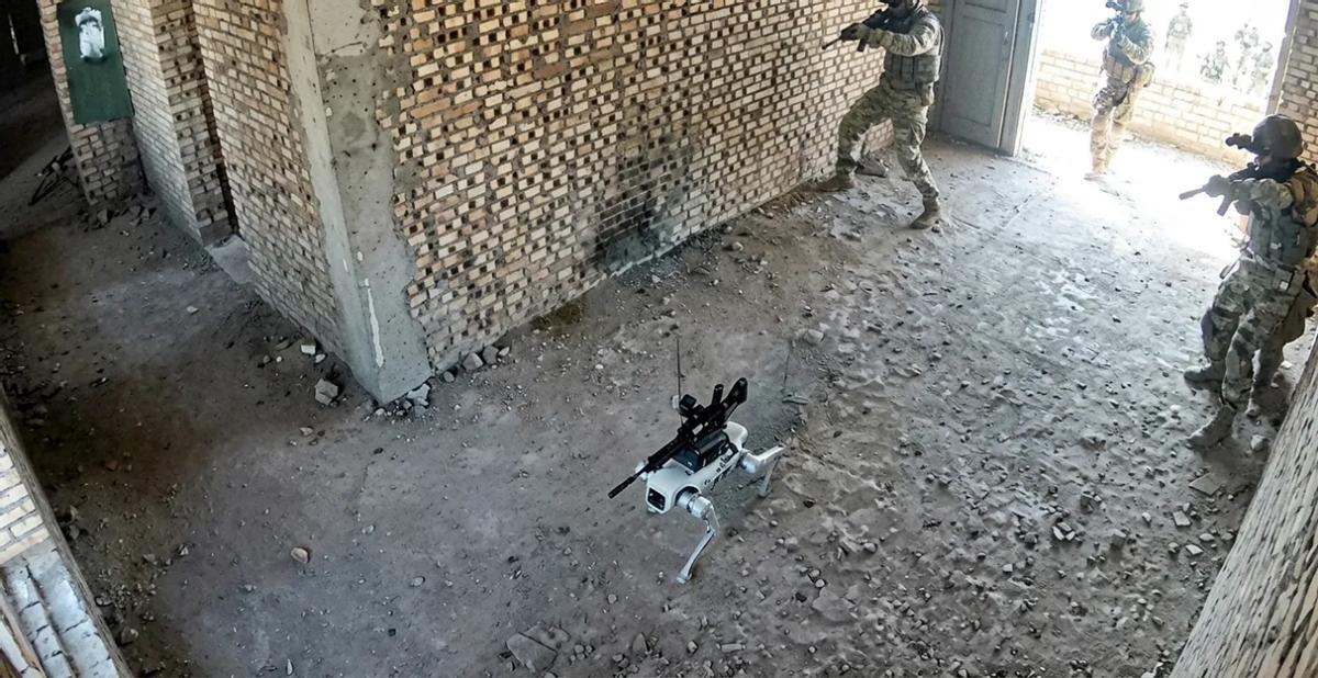 视频中,一只捎带突击步枪的机器狗手脚标兵冲入一栋建筑中,压制了阻塞大门的“敌东谈主”,对方随后躲入一处房间中。