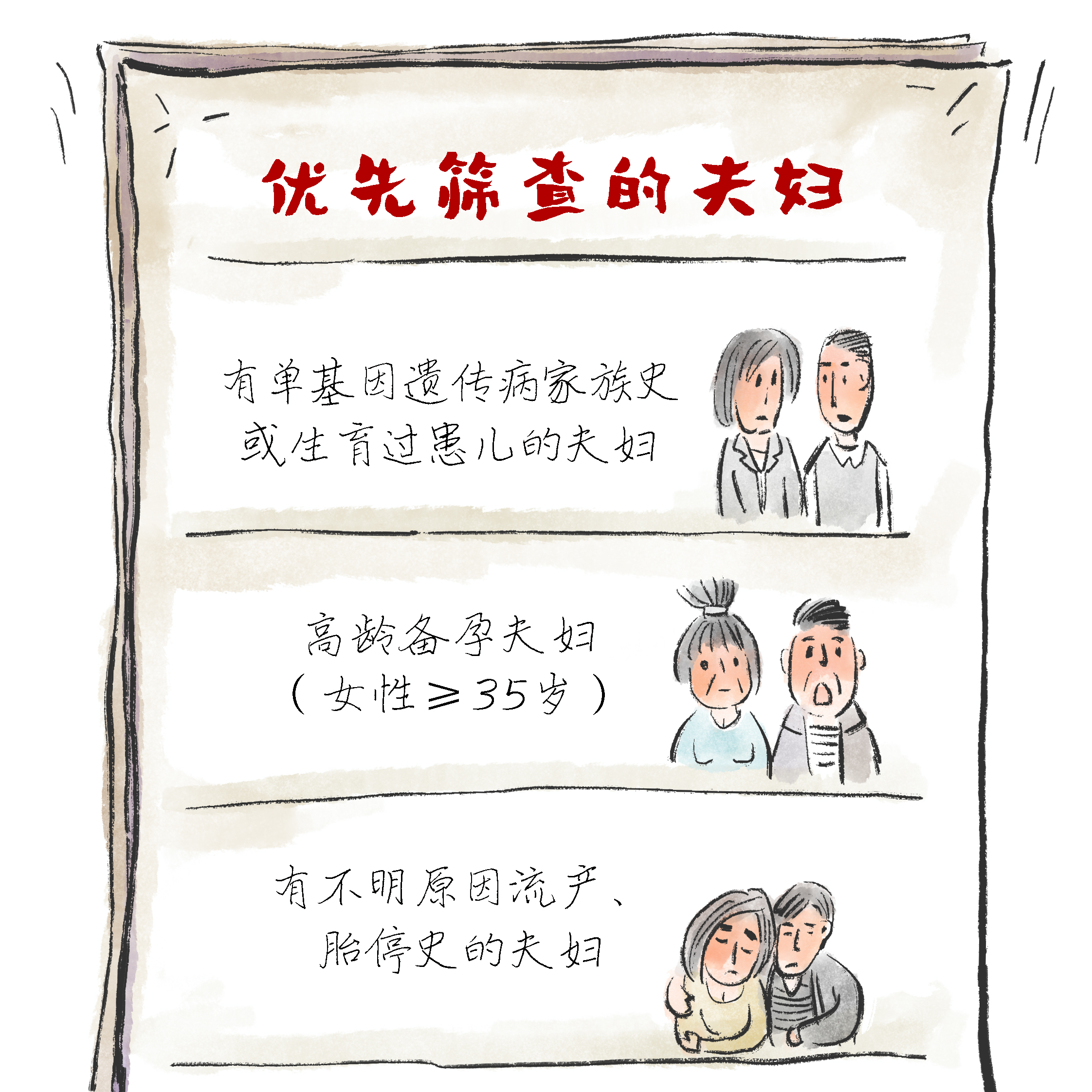 其中,有单基因遗传病家眷史或生养过患儿的鸳侣;乐龄备孕鸳侣(女性≥35岁);有不解原因流产、胎停史的鸳侣需优先筛查。