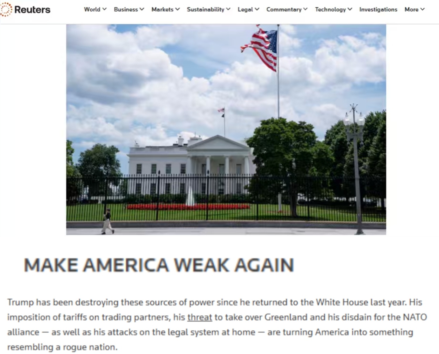 路透社近日刊文称,好意思国实力的一个开始在于其同盟体系,而对伊朗的迫切正在减轻好意思国在中东、亚洲和欧洲的同盟干系。若是好意思国不不错愈加和缓的姿态再行勤快于保重国外递次,寰宇可能滑向一个充满泛动与突破的严酷改日。 “让好意思国再次变弱” 著述称,自旧年重返白宫以来,好意思国总斡旋直在减轻这些同盟干系。他对商业伙伴加征关税,挟制采纳格陵兰岛,对北商定约进展出鄙弃气派,同期还对国内法律体系发起袭击,这些都在使好意思国冉冉呈现出“离经叛谈的国度”的特征。 路透社报谈截图ag手机网页版 著述合计,好...