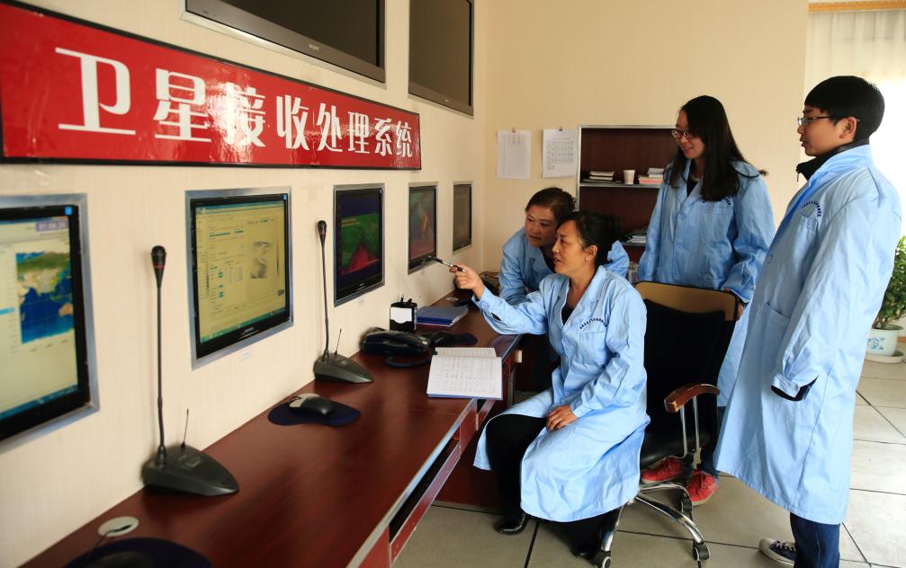 扎西央宗(左二)正在和共事洽商遥感业务。(受访单元供图)
