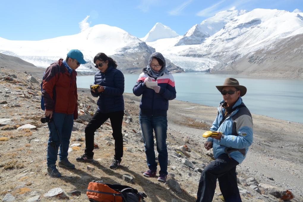 扎西央宗(左二)和团队成员在日喀则桑旺错冰川进行数据采集。(受访单元供图)