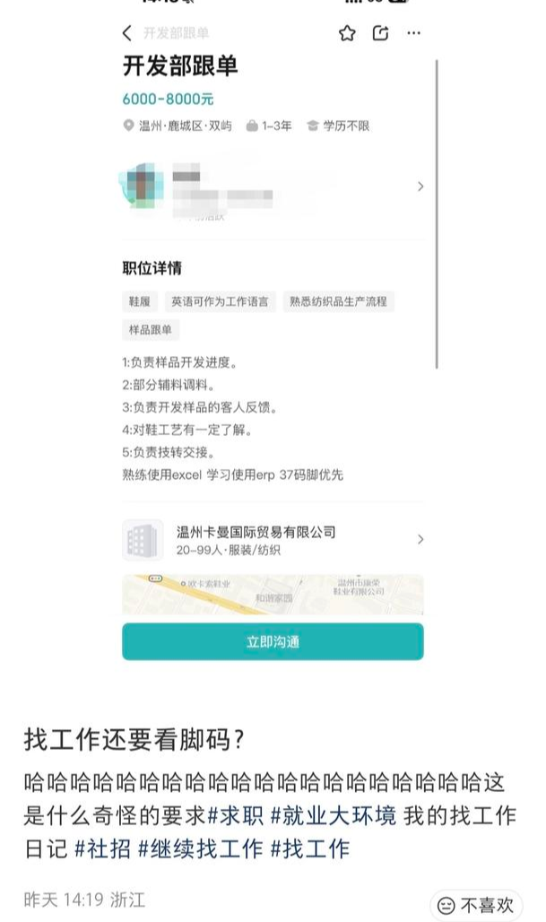 3月23日,有网友在酬酢平台发帖文称,温州一家公司在招聘历程中提倡“37码脚优先”的稀疏条款,激发网友存眷。