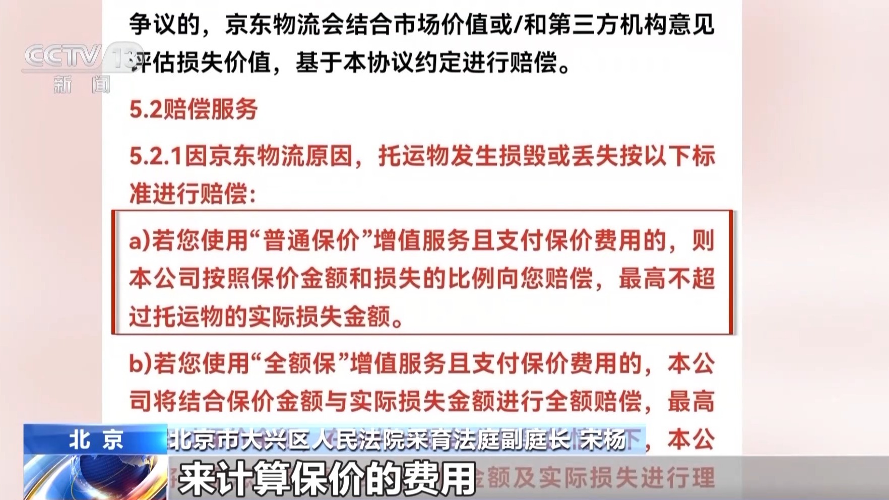 北京市大兴区东谈主民法院采育法庭副庭长 宋杨:快递管事条约商定,保价情况的话,根据保价金额以及耗损比例来盘算保价用度,且不得跳跃托运物的现实耗损,是以法院根据这个商定进行裁判。