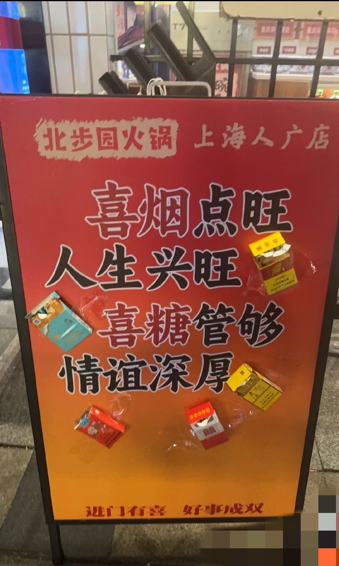 有网友暗意,不单这一家店,该暖锅品牌的其他门店也有访佛宣传。从网友发布的图片不错看到,北步园暖锅上海东谈主民广场店门口摆着一个写有“喜烟点旺 东谈主生兴旺”等笔墨的牌子,上头相同贴着绽开的香烟盒,盒中装着香烟。
